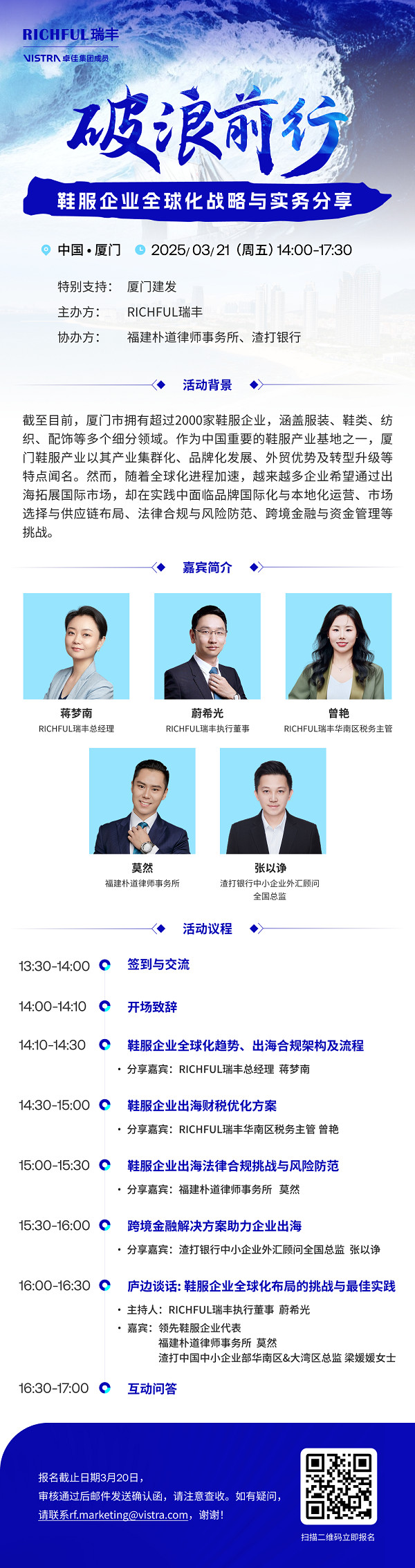 | 3月21日 厦门 | 破浪前行——鞋服企业全球化战略与实务分享_瑞丰德永 - 瑞豐德永国际商务(中国)有限公司