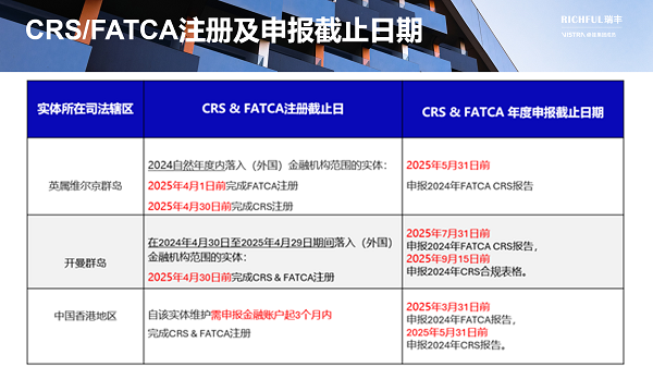 如果您仍然不确定实体是否落入CRS/FATCA范围,或者需要我们协助注册/申报等合规事宜,请尽快联系为您提供专属服务的RICHFUL瑞丰客户经理,以寻求支持,我们将竭诚为您服务。