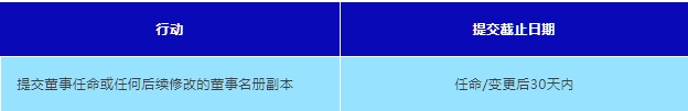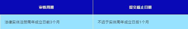 在财务年度结束后6个月内提交。大型实体和非大型非控股实体必须准备年度财务总结,并保存在其注册办公室。常见截止日期: